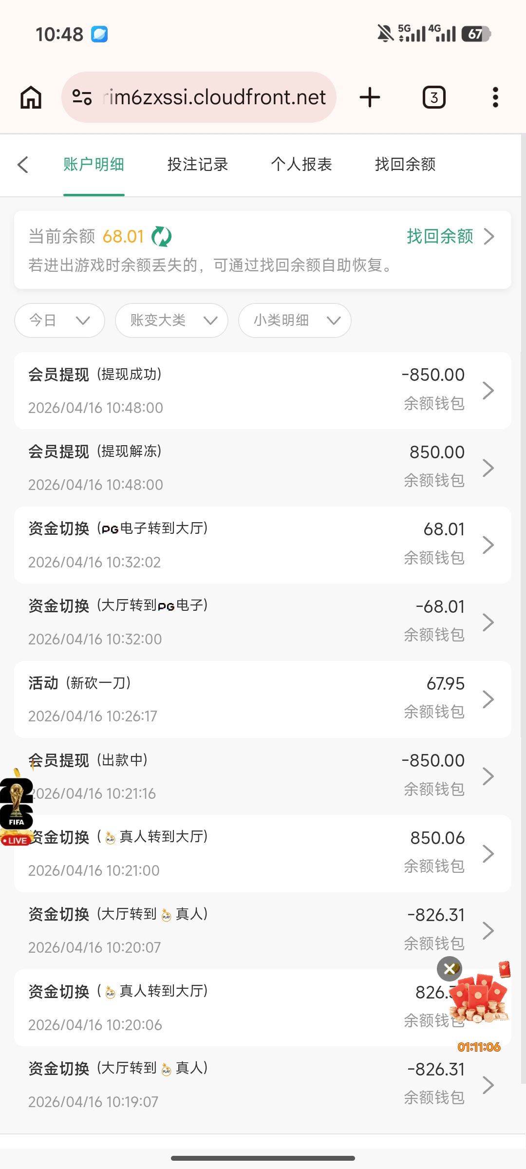 先去活动验证电话领了彩金,赢了就充20提现,这个平台还算稳的,目前没有人被黑过,可以上,另外那个转盘也可以试试看,转到多少都可以直接领取,不过先要有一笔充值才可以直接领取,隔壁论坛有人领了68没有拉人已经出了800块,可以上,有图有真相.