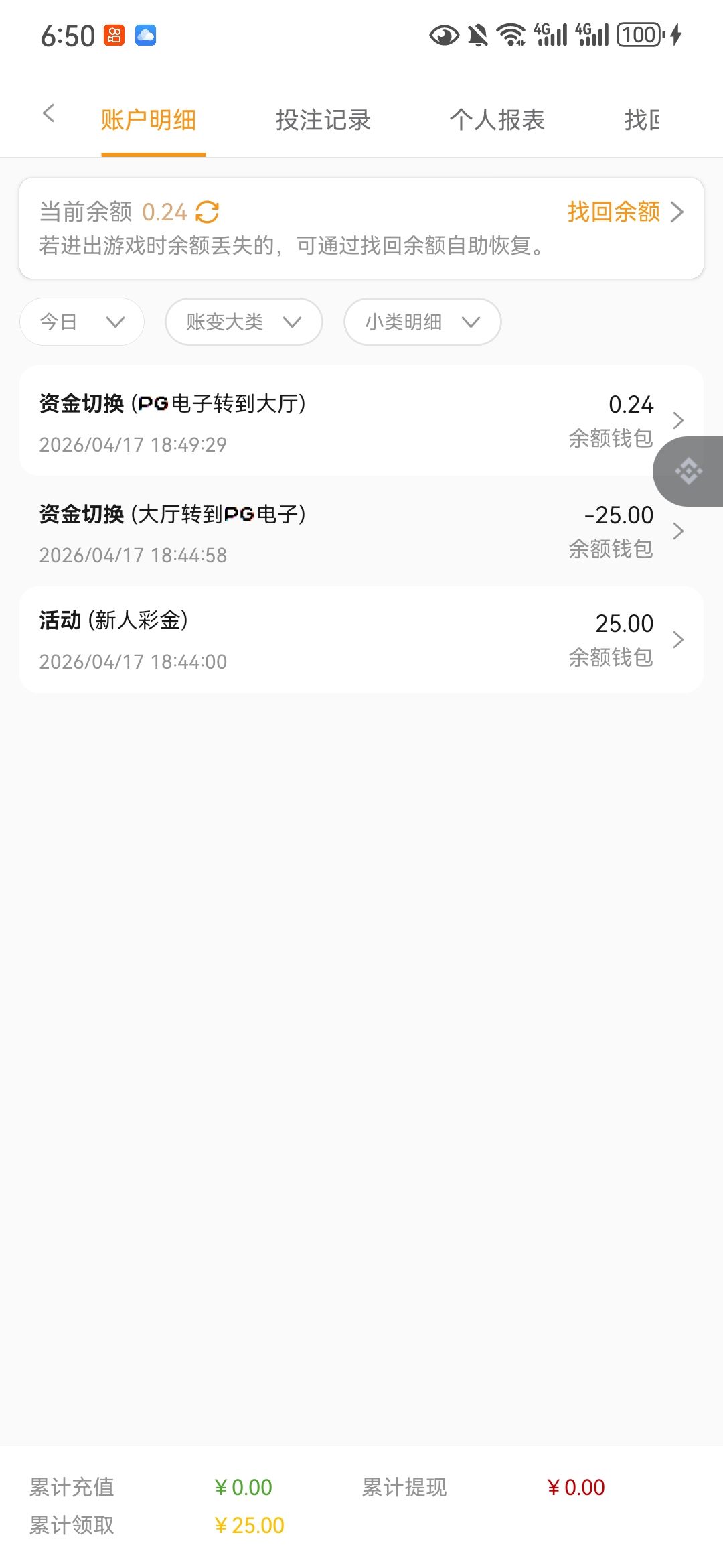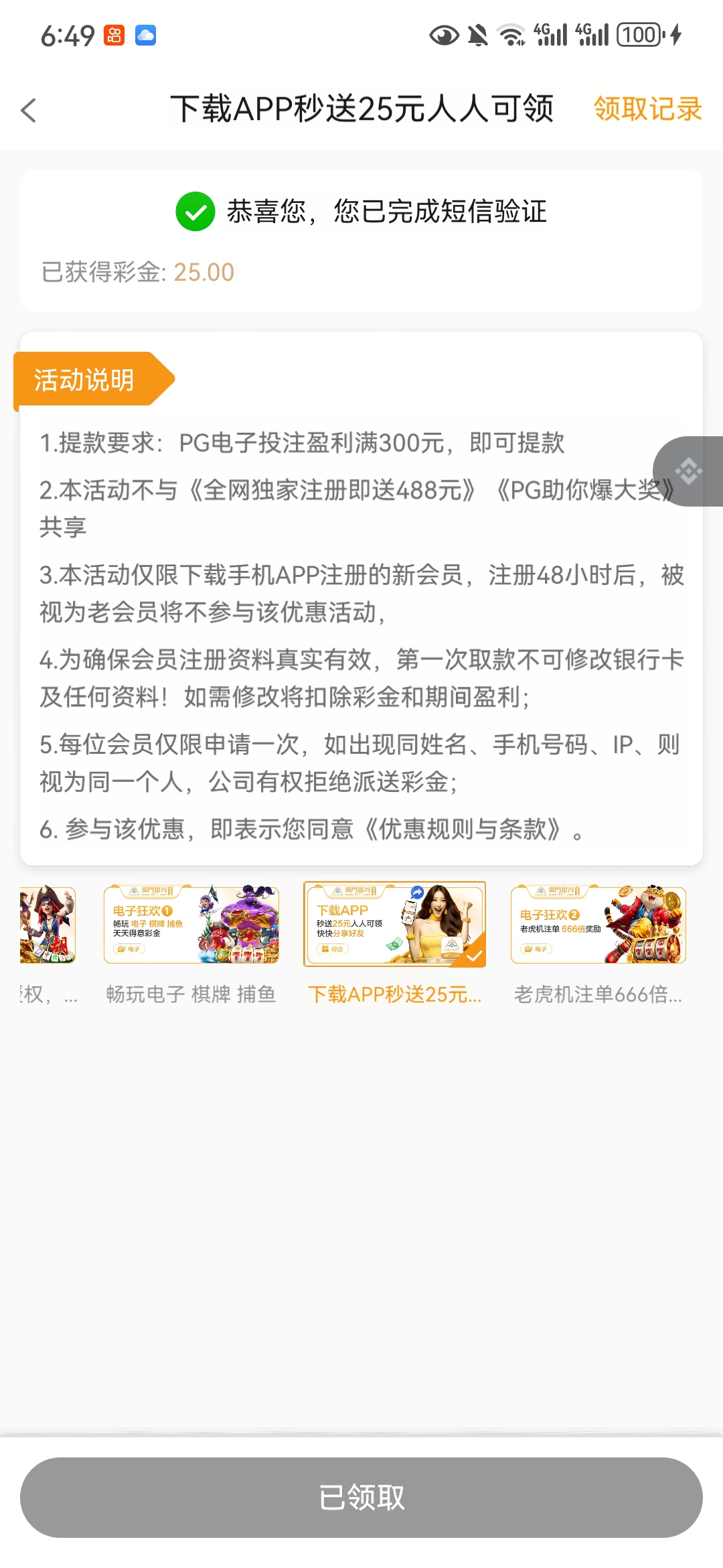 收到短信特邀,手机号注册下载app登录领取了25彩金,脸黑没打出来